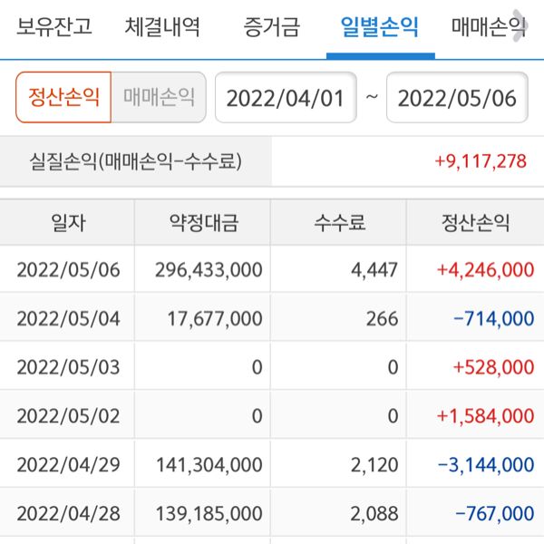역시. 수익이내요~~ 비중 조절 잘하고. 믿고 기다리니 이번도 수익으로 마무리됐네요. 4월 마지막 거래도 잘 종료됐고 5월도 화이팅입니다